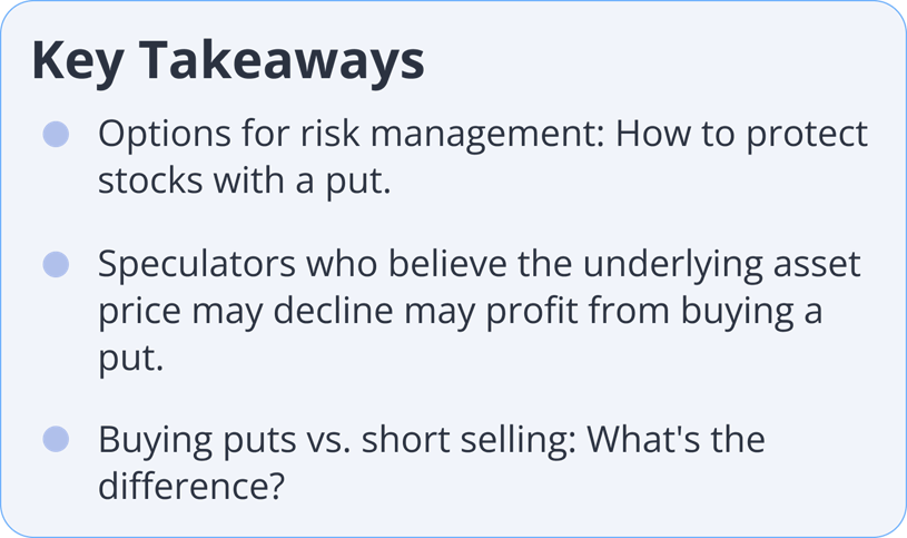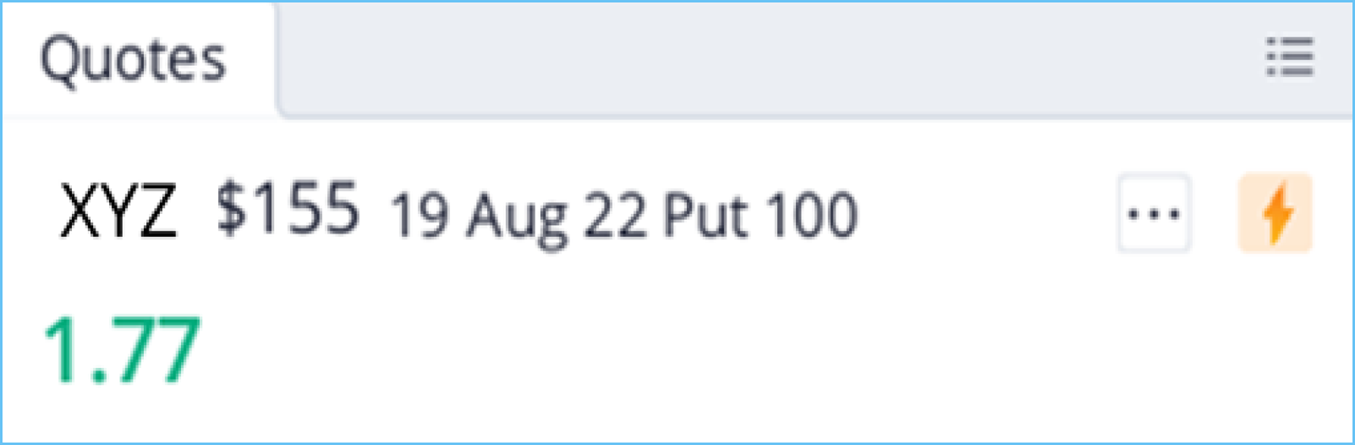 Here's an example: Say you own XYZ stock trading at $160 per share and worry about how some potential news may affect its near-term prospects. So, you may buy the above Put Option, which costs you USD177. If XYZ stock drops below USD155 by 19 August 2022, the buyer can still sell the shares at USD155 no matter how low the market price is. Thus, you've capped your risk to the downside of the stock. When the stock price remains sideways or trends upside, it is not economical to exercise the put option, so the Put Option is likely to expire worthless. The investor keeps the potential profit if the stock continues to rise while holding the underlying assets.